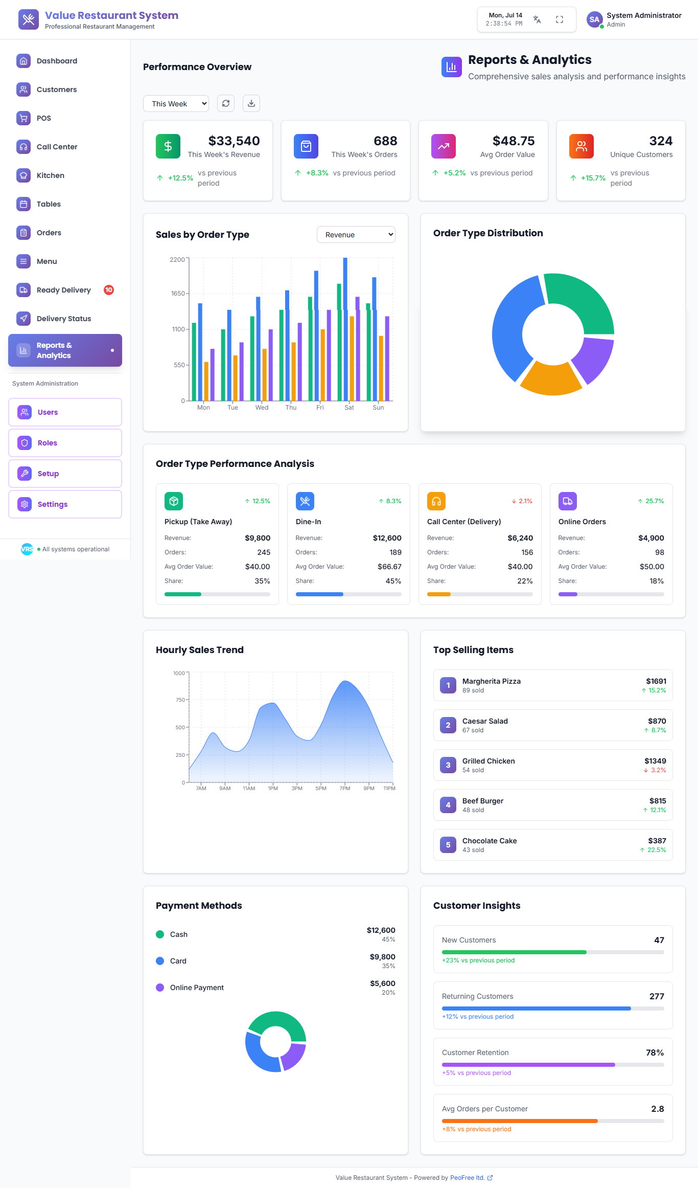 Sales performance. Top-selling items. Order types (POS, Call, Online). Payment method breakdown.