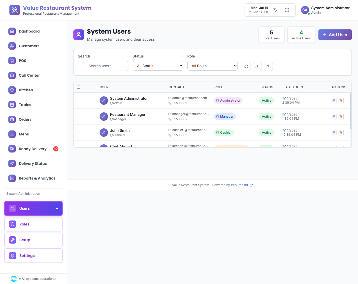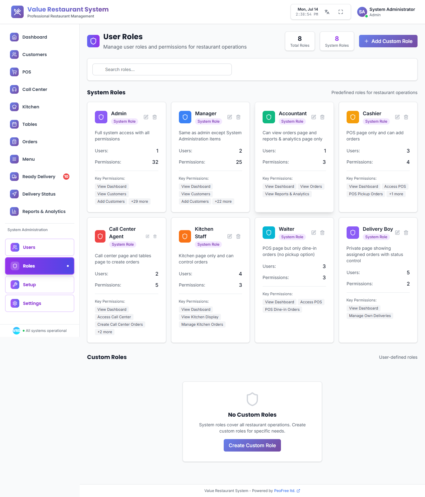Built-in roles: Admin, Manager, Cashier, Chef, Delivery Boy. Create custom roles for special needs. Assign users to roles with permissions.